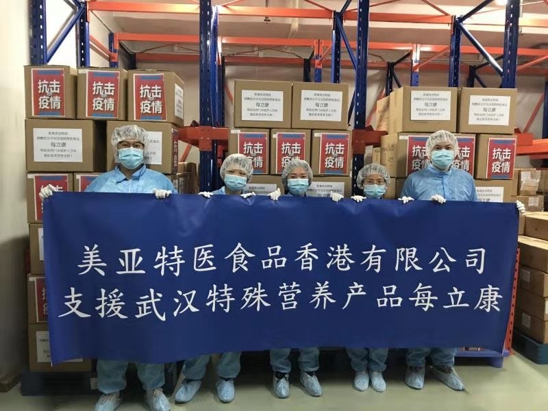 香港美亞特醫(yī)作為一家專注于特醫(yī)食品研發(fā)生產(chǎn)的香港企業(yè),也積極主動參與到扛疫一線,首批捐獻的價值120萬的物資已于1月底送至武漢疫情一線的的7家三甲醫(yī)院。